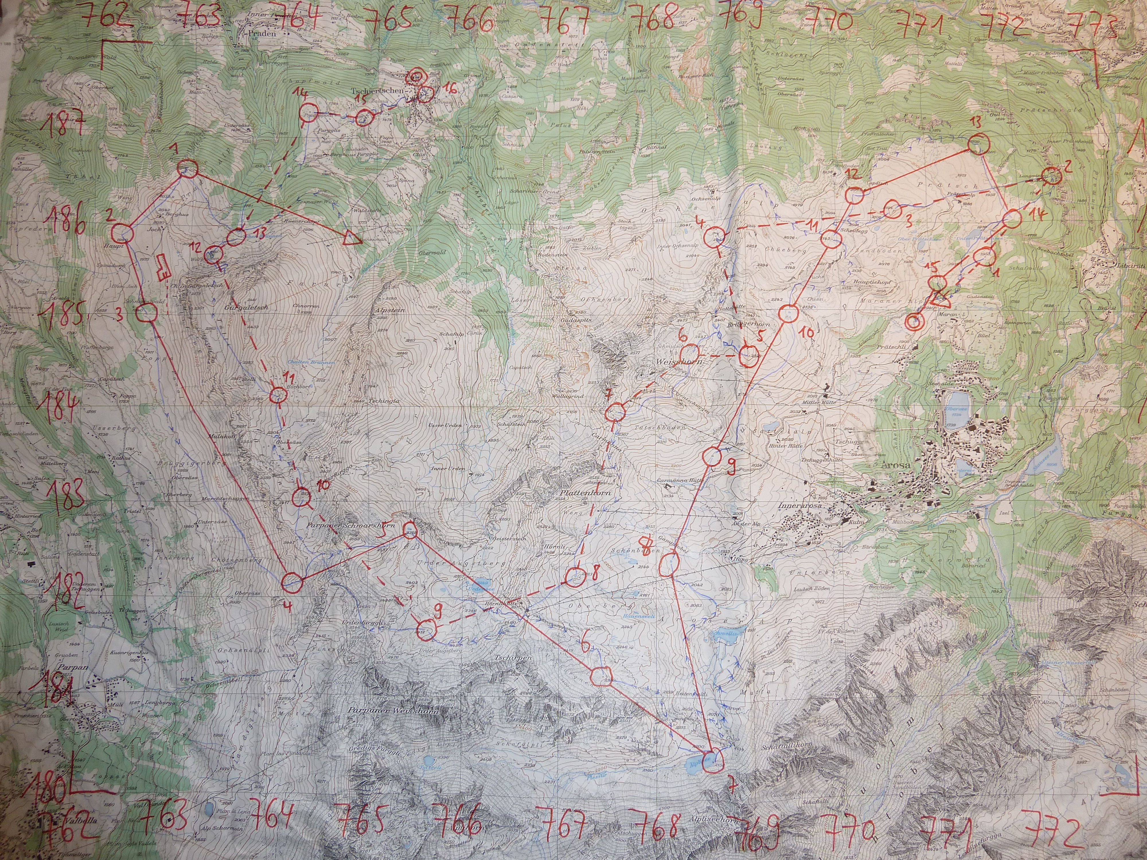 Mit der Sesselbahn ging es an den Massenstart, wo wir pünktlich um 10.30 die Koordinaten der Posten ausgehändigt bekamen. Speziell am R’adys ist nicht nur die Dauer und die Distanz, sondern auch, dass die Posten aus den Koordinaten herausgelesen und auf die Laufkarte (1:25‘000 Landeskarte) übertragen werden müssen. Selbstverständlich war das meine Aufgabe, da ich das ja schliesslich schon bei den Pfadfindern gelernt hatte!