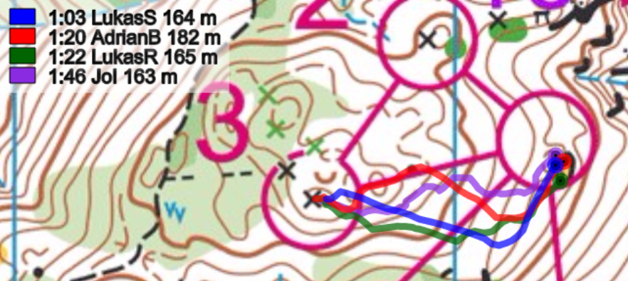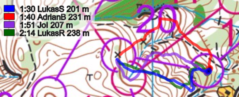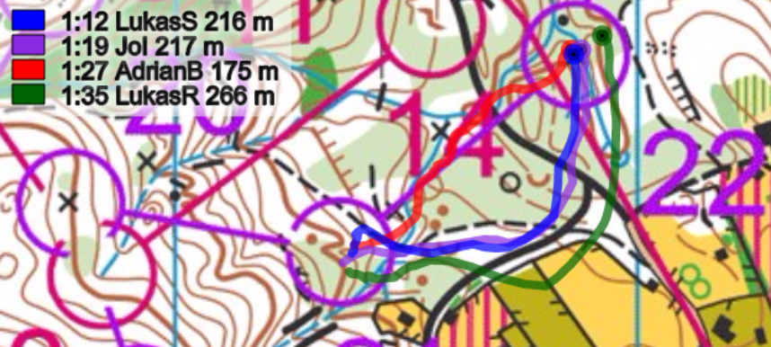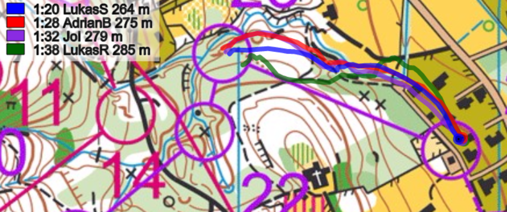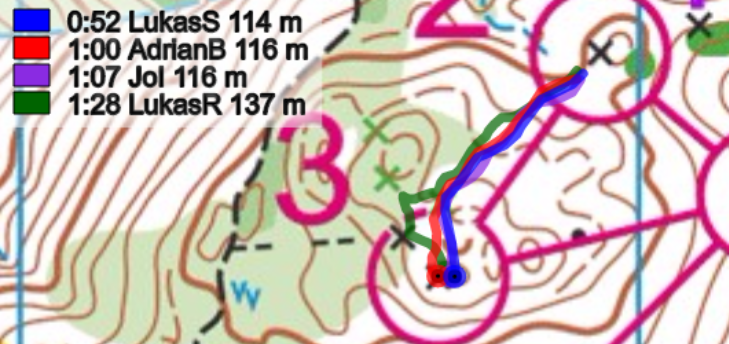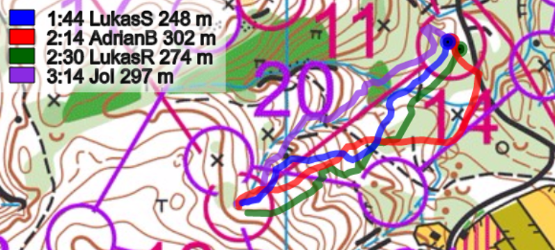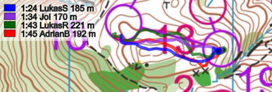 Start-1: Schon der erste Posten forderte die Läufer. Es galt eine Routenwahl zu lösen, welche zwei Varianten erlaubte. Die linke Route entlang des kleinen Weges und später einere längeren Querstrecke, erforderte schon zu Beginn gute Navigationsskills. Die Alternative: Die direktere Variante am Weg entlang, um dann anschliessend steil zum Posten zu laufen. Die beiden Lukas wählten die linke Route, wo dabei Reichmuth die eher längere Querteilstrecke zum Verhängnis wurde. Brändli und Iten wählten die Sicherheitsroute und konnten den Posten ohne grosse Mühe anlaufen. Ein Blick auf die Zwischenzeiten zeigt, dass beiden Routen mehr oder weniger identisch waren - eine Annahme die auch schon heftigst vor dem Wettkampf auf einer früheren Bahn zwischen den Parteien diskutiert wurde.