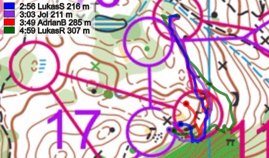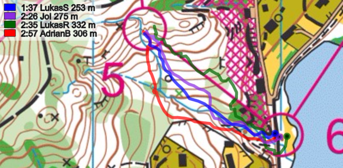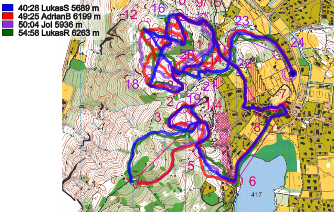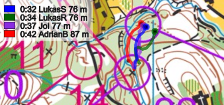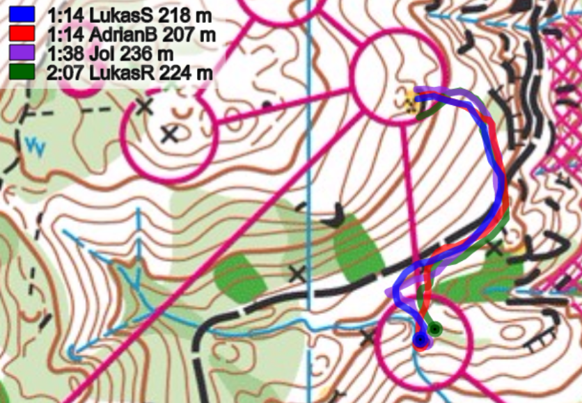 4-6: Diese Posten werden zusammengefasst, da es eigentlich nur um eines ging: Wer ist der Downhill-Champ? Nachdem Brändli auf den Posten 5 Schubnell diesen Titel noch streitig machen wollte, kostete ihn seine Routenwahlentscheidung auf den sechsten Posten, wertvolle Sekunden. Die Entscheidung rechts vom Bach und dann anschliessend entlang des Zauns zu laufen entsprachen einem weiteren Weg. Ein direktes Anlaufen links vom Bach (Iten) war hier besser.