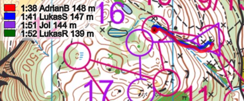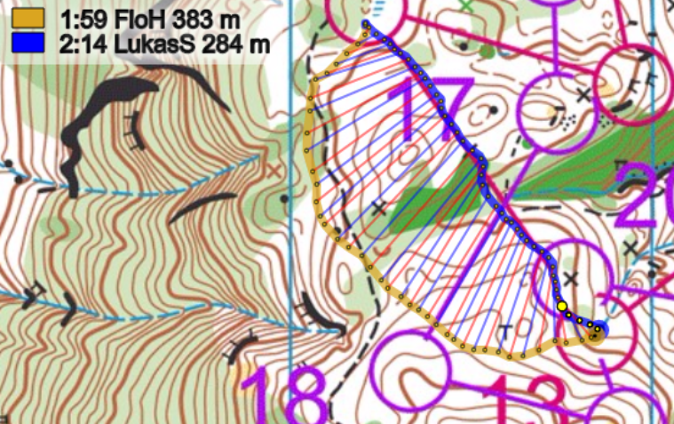 17-18: Iten mit seiner Kompassstärke machte hier wieder alles richtig und lief auf dem Strich wie kein anderer und puschte sich ohne wenn und aber den Hügel hinauf. So hatte auch der laufstarke Reichmuth, der momenten gerade in der Aufbauphase für die kommende SOLA ist, keine Chance hier den Routinier zu schlagen. Brändli auf der Umlaufroute verlor zwar etwas Zeit, konnte aber das Sicherheitsgefühl nach seinem Doppelfehler wieder aufbauen.