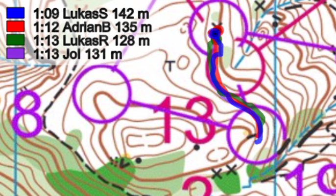 11-12: Iten zeigte hier seine Kompassstärke und lief über 12m direkter als der Rest der Gruppe auf diesem eher flachen Streckenabschnitt. Brändli, welcher weiter rechts um den Hügel (letzten drittel des Posten) lief, wählte hier nicht die Idealroute und blieb im dichten Grün eine Zeit lang stecken.