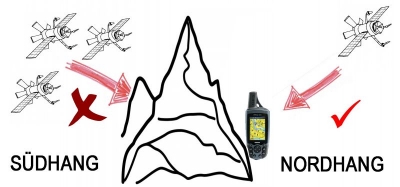 Anmerkung zur Strecke: Die gelaufene Strecke ist ausserdem für eine genaue GPS-Lokalisierung teils sehr schwierig. Die Strecke befindet sich in einem Nordhang. Es bedeutet, dass das Gerät (weil der Berg zu hoch ist) keinen Kontakt mit Satelliten aus dem Süden aufbauen kann und somit ungenauere Daten liefert. Ausserdem hat es weniger Satelliten im Norden, dafür mehr im Süden bzw. auf der Höhe des Äquators. Wenn also ein Gerät in einem Nordhang benützt wird, hat es einen schlechteren Empfang als in einem Südhang. Hier noch eine schematische Zeichnung:
